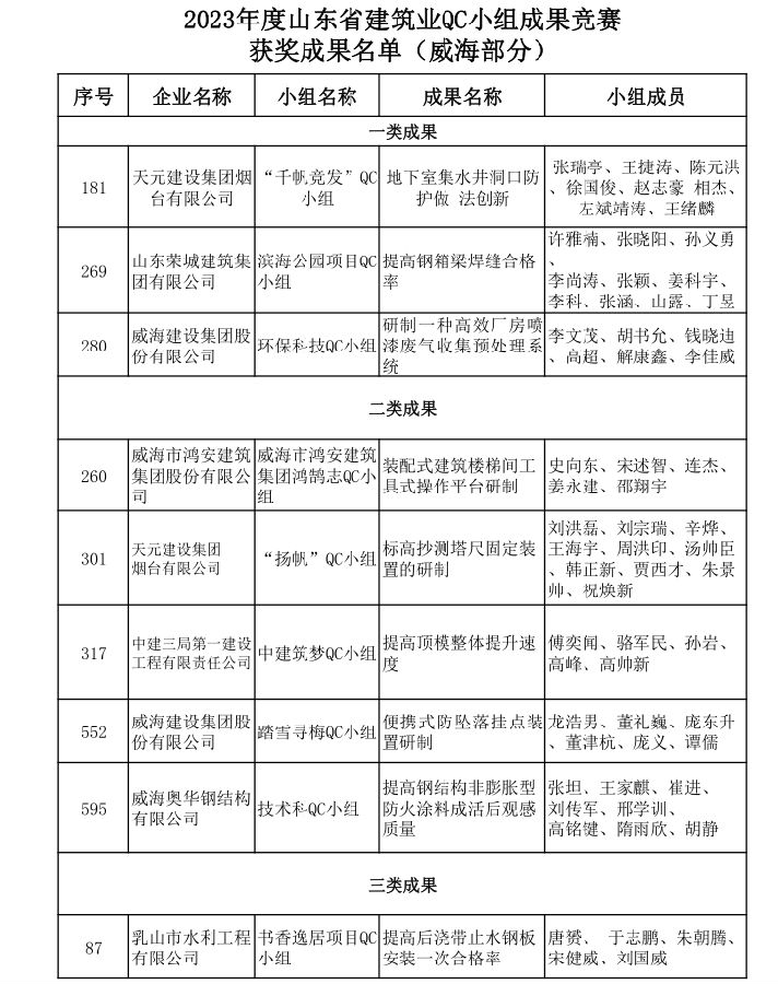 近日,山東省建筑業(yè)協(xié)會下發(fā)《關(guān)于公布2023年度山東省建筑業(yè)QC小組成果競賽獲獎(jiǎng)成果的通知》,我市22項(xiàng)成果榮獲2023年度山東省建筑業(yè)QC小組競賽獲獎(jiǎng)成果,其中,一等獎(jiǎng)3項(xiàng),二等獎(jiǎng)5項(xiàng),三等獎(jiǎng)20項(xiàng)。