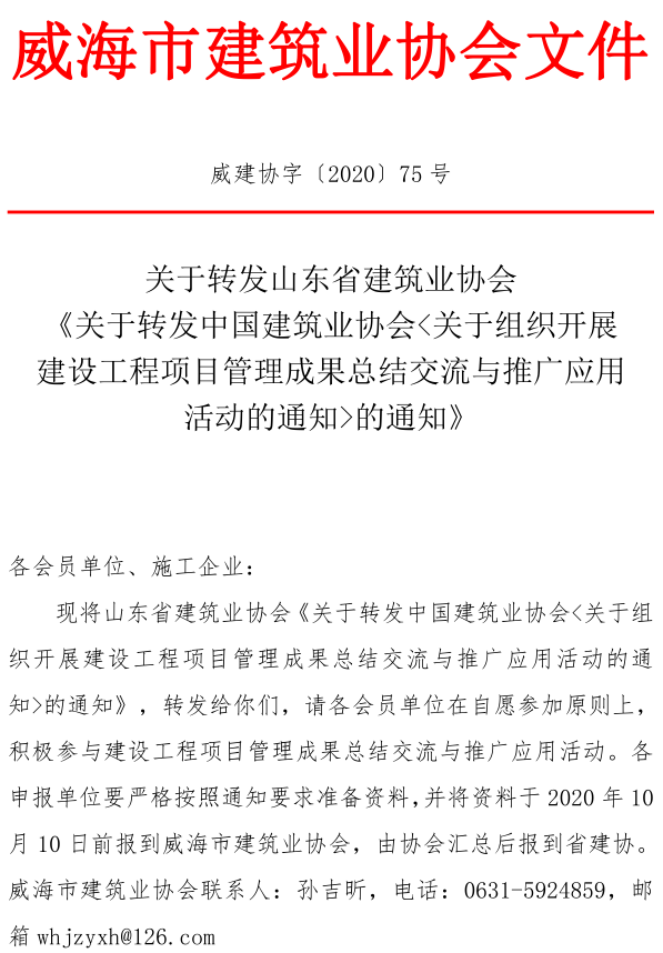 關(guān)于轉(zhuǎn)發(fā)山東省建筑業(yè)協(xié)會 《關(guān)于轉(zhuǎn)發(fā)中國建筑業(yè)協(xié)會<關(guān)于組織開展建設(shè)工程項目管理成果總結(jié)交流與推廣應(yīng)用 活動的通知>的通知》