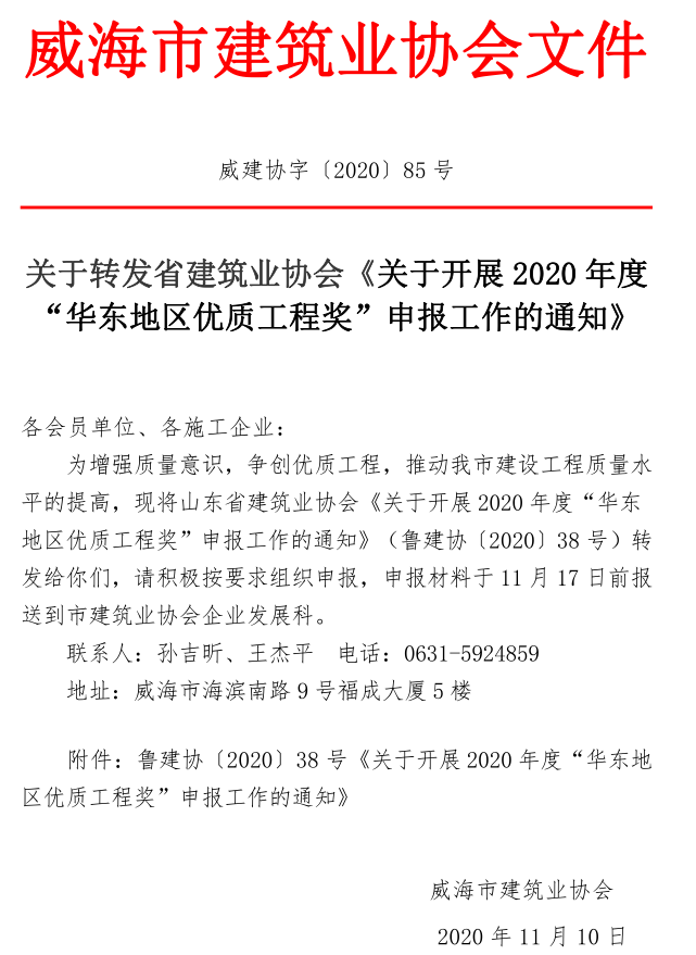 關(guān)于轉(zhuǎn)發(fā)省建筑業(yè)協(xié)會(huì)《關(guān)于開展2020年度“華東地區(qū)優(yōu)質(zhì)工程獎(jiǎng)”申報(bào)工作的通知》