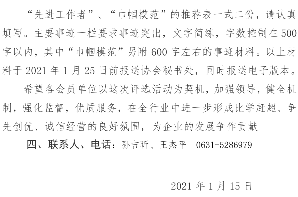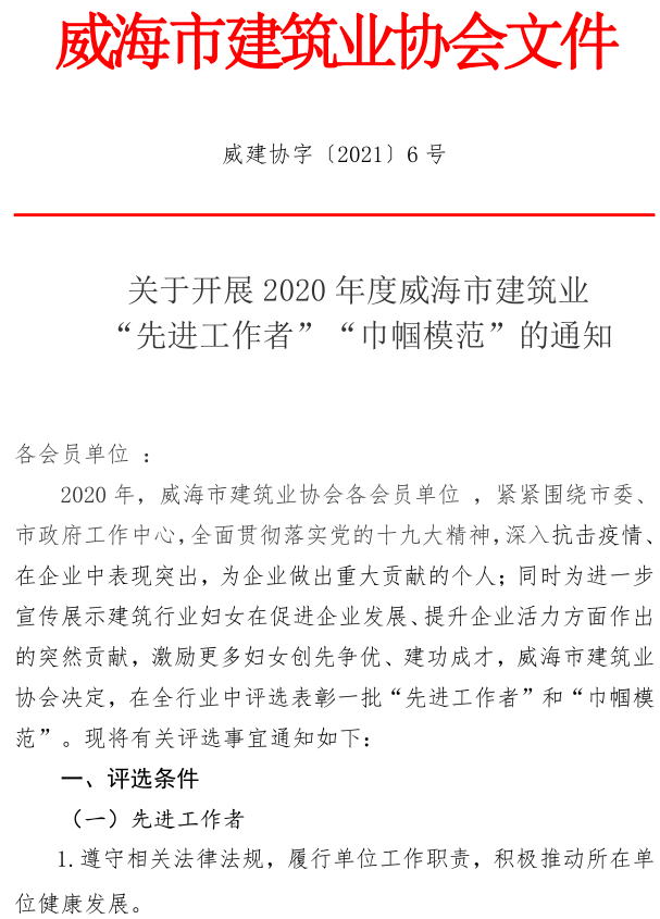關(guān)于開展2020年度威海市建筑業(yè) “先進工作者”“巾幗模范”的通知