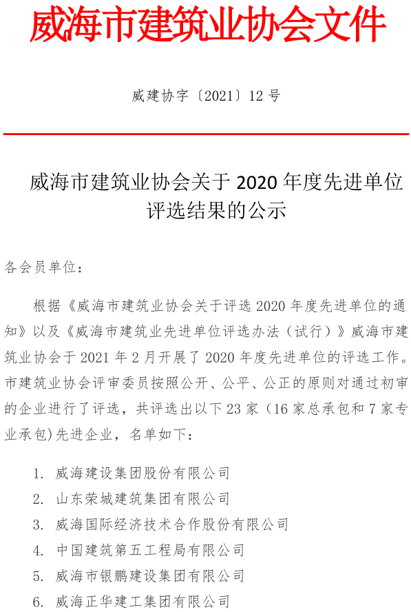 威海市建筑業(yè)協(xié)會關于2020年度先進單位評選結(jié)果的公示