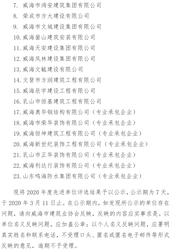 > 威海市建筑業(yè)協(xié)會關于2020年度先進單位評選結(jié)果的公示