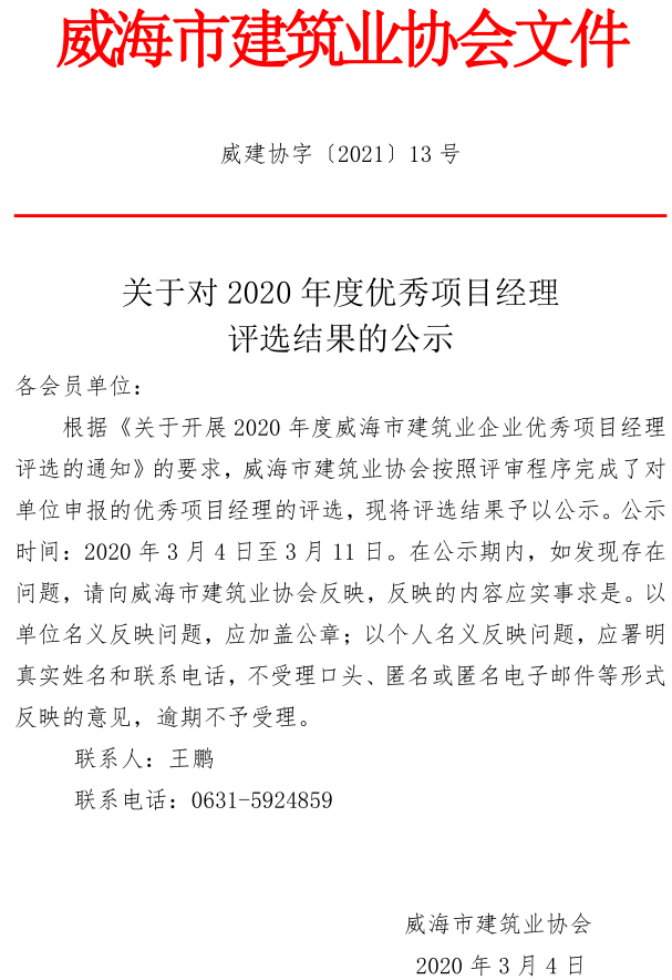 關(guān)于對(duì)2020年度優(yōu)秀項(xiàng)目經(jīng)理評(píng)選結(jié)果的公示
