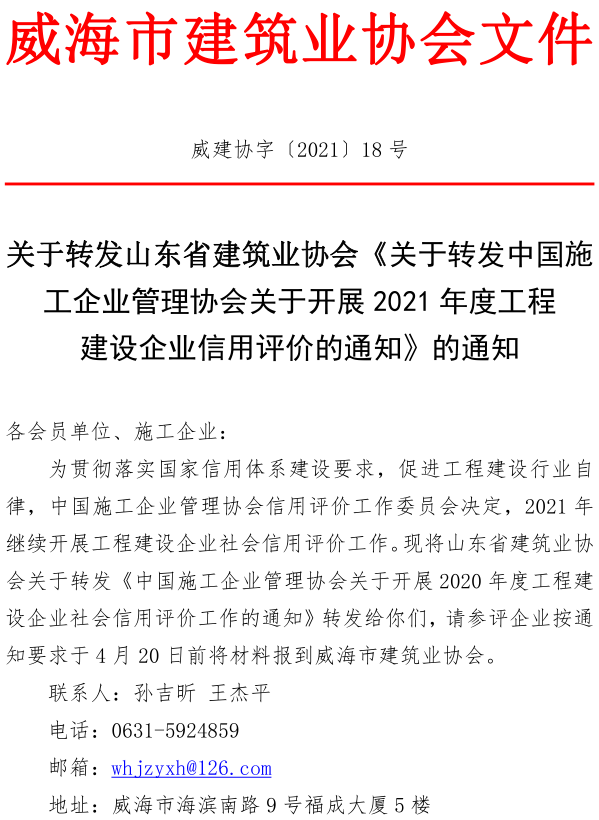 關(guān)于轉(zhuǎn)發(fā)山東省建筑業(yè)協(xié)會(huì)《關(guān)于轉(zhuǎn)發(fā)中國(guó)施工企業(yè)管理協(xié)會(huì)關(guān)于開(kāi)展2021年度工程 建設(shè)企業(yè)信用評(píng)價(jià)的通知》的通知