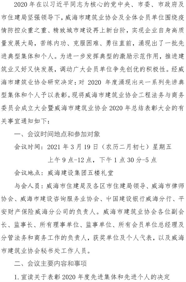 關(guān)于召開威海市建筑業(yè)協(xié)會(huì)工程法務(wù)與商務(wù) 工作委員會(huì)成立大會(huì)暨威海市建筑業(yè)協(xié)會(huì) 2020年總結(jié)表彰大會(huì)的通知