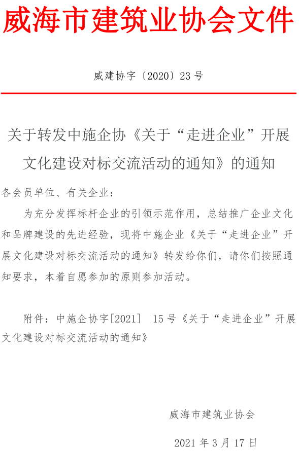 關于轉(zhuǎn)發(fā)中施企協(xié)《關于“走進企業(yè)”開展 文化建設對標交流活動的通知》的通知