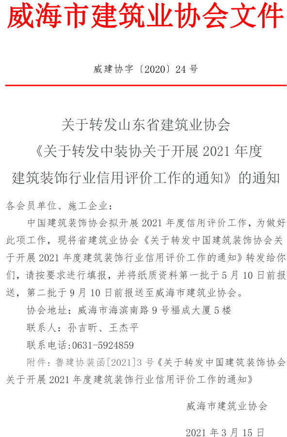 關(guān)于轉(zhuǎn)發(fā)山東省建筑業(yè)協(xié)會(huì) 《關(guān)于轉(zhuǎn)發(fā)中裝協(xié)關(guān)于開(kāi)展2021年度 建筑裝飾行業(yè)信用評(píng)價(jià)工作的通知》的通知