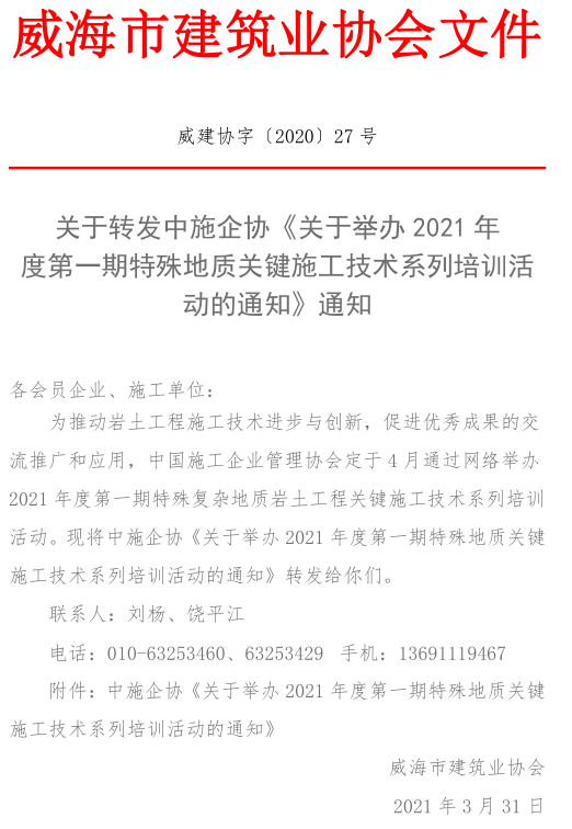 >關于轉發(fā)中施企協(xié)《關于舉辦2021年 度第一期特殊地質關鍵施工技術系列培訓活動的通知》通知