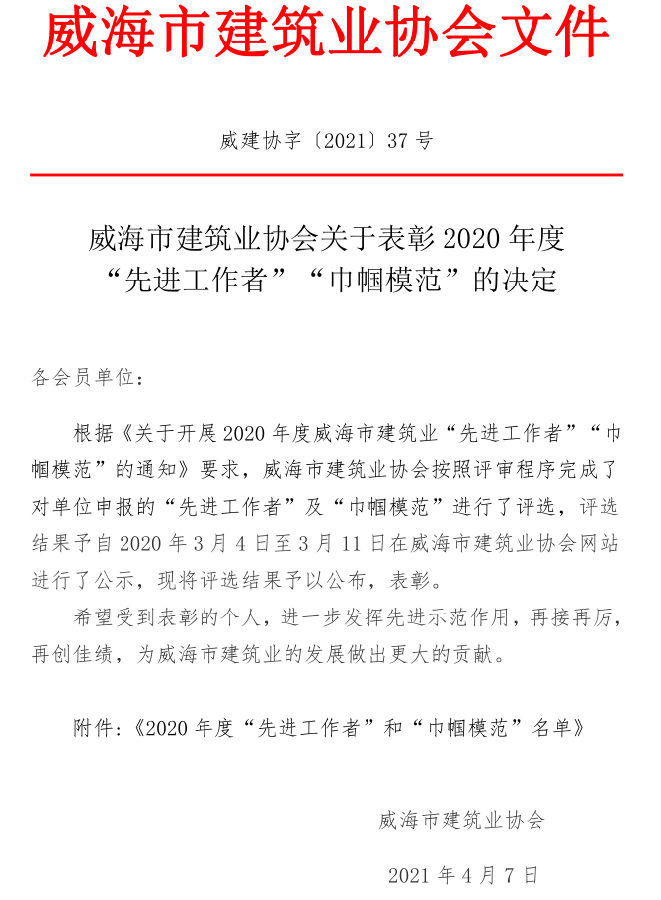 威海市建筑業(yè)協(xié)會(huì)關(guān)于表彰2020年度 “先進(jìn)工作者”“巾幗模范”的決定