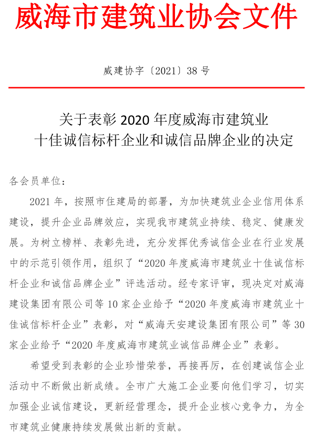 關(guān)于表彰2020年度威海市建筑業(yè) 十佳誠(chéng)信標(biāo)桿企業(yè)和誠(chéng)信品牌企業(yè)的決定
