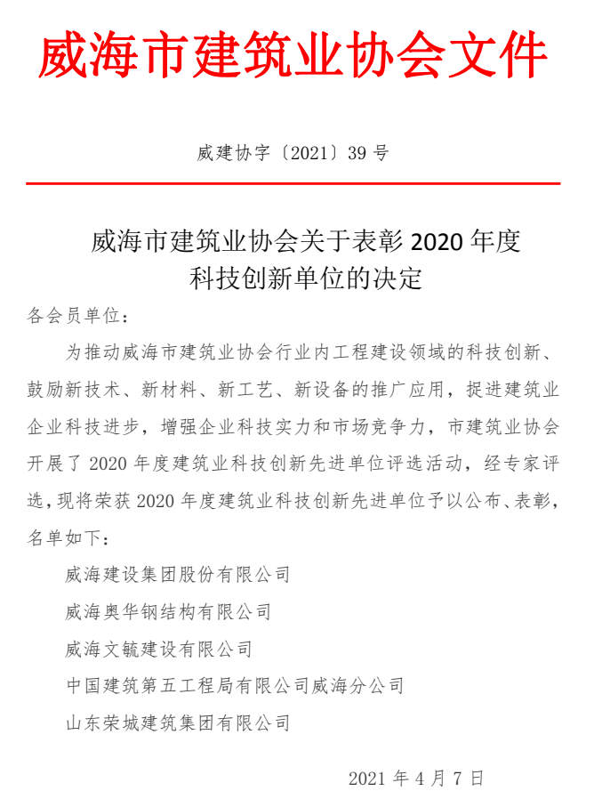 >威海市建筑業(yè)協(xié)會關于表彰2020年度 科技創(chuàng)新單位的決定