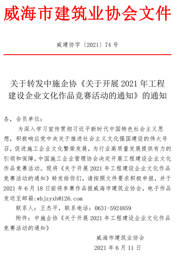 關(guān)于轉(zhuǎn)發(fā)中施企協(xié)《關(guān)于開展2021年工程 建設(shè)企業(yè)文化作品競賽活動的通知》的通知
