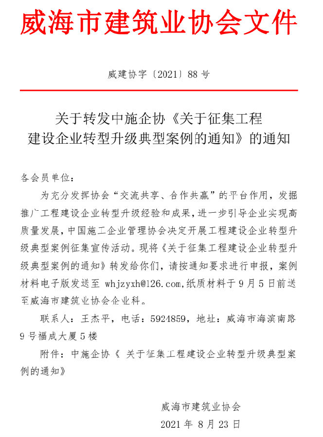 >關(guān)于轉(zhuǎn)發(fā)中施企協(xié)《關(guān)于征集工程 建設(shè)企業(yè)轉(zhuǎn)型升級典型案例的通知》的通知