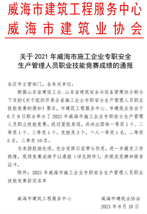 >關(guān)于2021年威海市施工企業(yè)專(zhuān)職安全 生產(chǎn)管理人員職業(yè)技能競(jìng)賽成績(jī)的通報(bào)