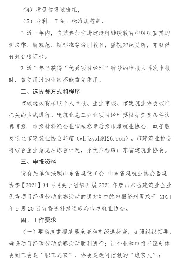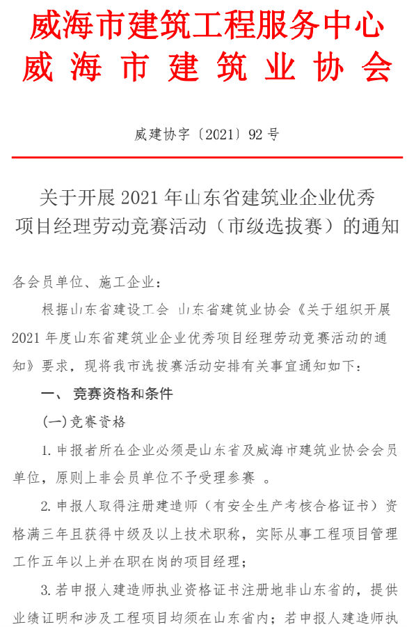 關(guān)于開展2021年山東省建筑業(yè)企業(yè)優(yōu)秀 項(xiàng)目經(jīng)理勞動(dòng)競(jìng)賽活動(dòng)(市級(jí)選拔賽)的通知