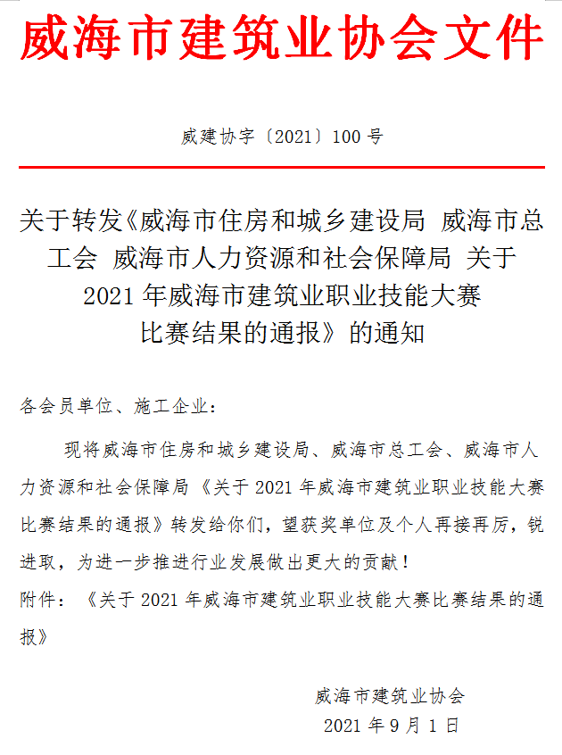 關于轉(zhuǎn)發(fā)《威海市住房和城鄉(xiāng)建設局 威海市總工會 威海市人力資源和社會保障局 關于2021年威海市建筑業(yè)職業(yè)技能大賽 比賽結(jié)果的通報》的通知