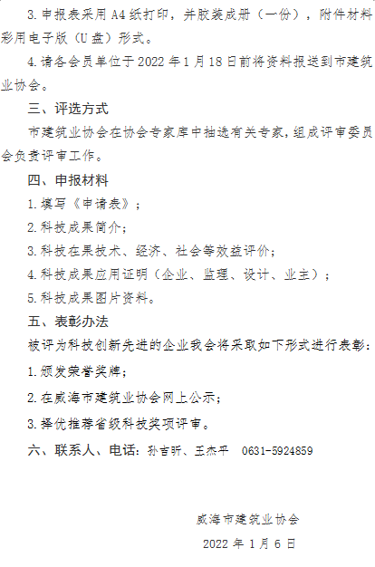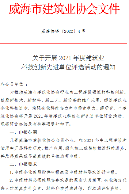 >關(guān)于開展威海市2021年度威海市建筑業(yè)科技創(chuàng)新先進(jìn)單位評選活動的通知