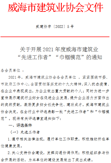 >關(guān)于開展2021年度威海市建筑業(yè)“先進(jìn)工作者”“巾幗模范”的通知