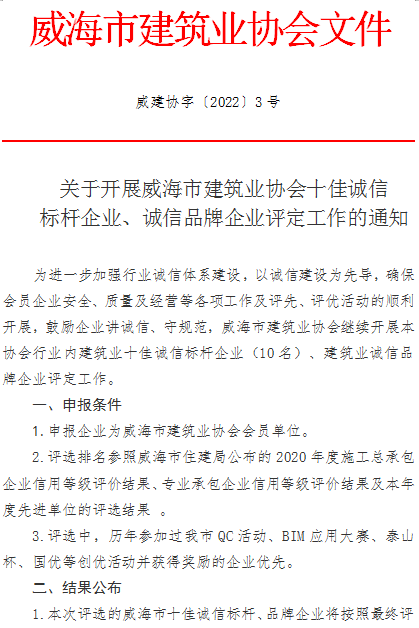 關于開展威海市建筑業(yè)誠信標桿企業(yè)、誠信品牌企業(yè)評定工作的通知