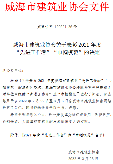 >威海市建筑業(yè)協(xié)會關(guān)于表彰2021年度“先進(jìn)工作者”“巾幗模范”的決定