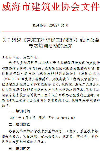 關(guān)于組織《建筑工程評(píng)優(yōu)工程資料》線上公益專題培訓(xùn)活動(dòng)的通知