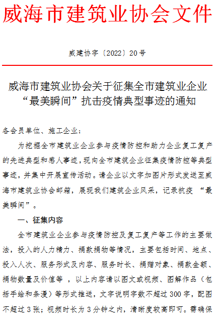威海市建筑業(yè)協(xié)會(huì)關(guān)于征集全市建筑業(yè)企業(yè)“最美瞬間”抗擊疫情典型事跡的通知
