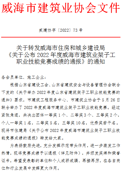 >關(guān)于轉(zhuǎn)發(fā)威海市住房和城鄉(xiāng)建設(shè)局《關(guān)于公布2022年度威海市建筑業(yè)架子工職業(yè)技能競賽成績的通報》的通知