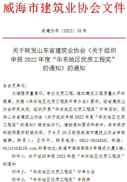 關于轉(zhuǎn)發(fā)山東省建筑業(yè)協(xié)會《關于組織申報2022年度“華東地區(qū)優(yōu)質(zhì)工程獎”的通知》的通知