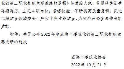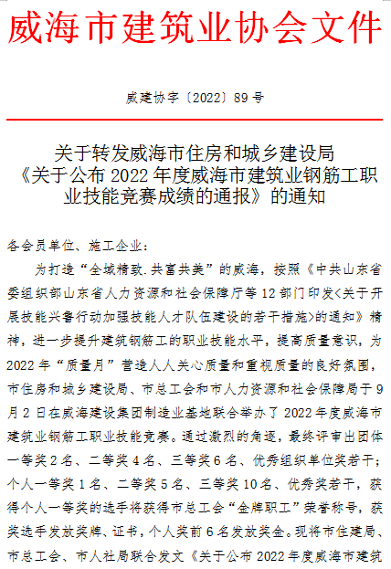 >2022年89號(hào)關(guān)于轉(zhuǎn)發(fā)威海市住房和城鄉(xiāng)建設(shè)局《關(guān)于2022年度威海市建筑業(yè)鋼筋工職業(yè)技能競(jìng)賽成績(jī)的通報(bào)》的通知