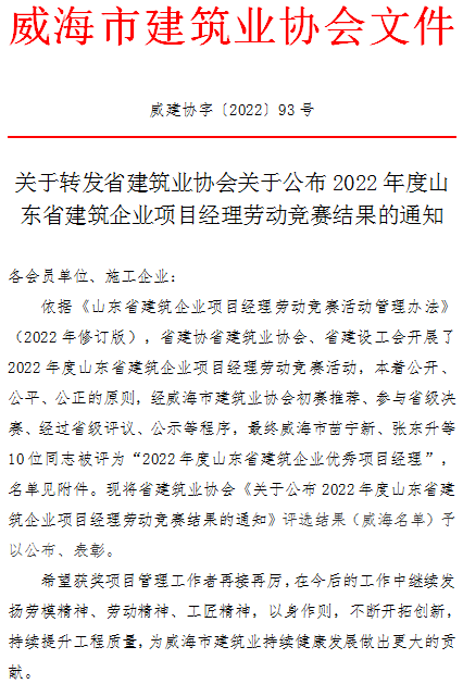 關(guān)于轉(zhuǎn)發(fā)省建筑業(yè)協(xié)會(huì)關(guān)于公布2022年度山東省建筑企業(yè)項(xiàng)目經(jīng)理勞動(dòng)競(jìng)賽結(jié)果的通知