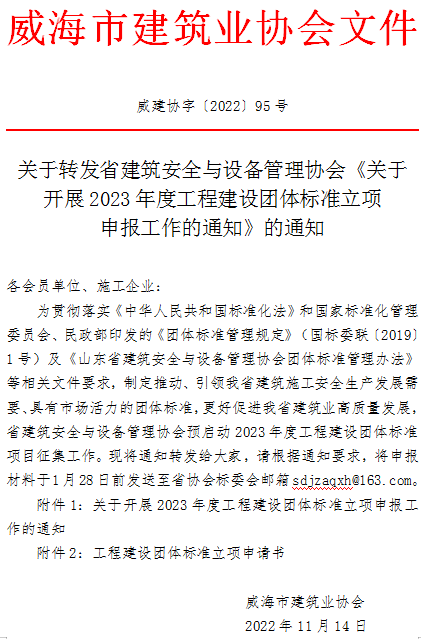 關(guān)于轉(zhuǎn)發(fā)省建筑安全與設(shè)備管理協(xié)會(huì)《關(guān)于開展2023年度工程建設(shè)團(tuán)體標(biāo)準(zhǔn)立項(xiàng)申報(bào)工作的通知》的通知