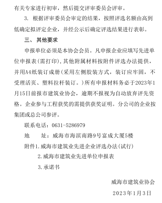 威海市建筑業(yè)協(xié)會關(guān)于評選 2022年度威海市建筑業(yè)先進單位的通知