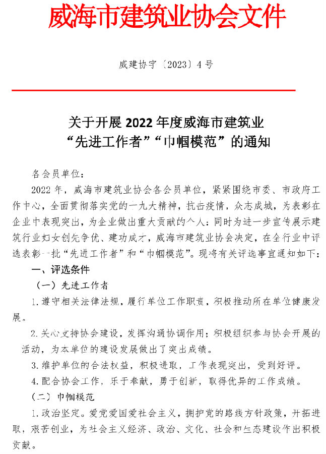 >關(guān)于開展2022年度威海市建筑業(yè) “先進工作者”“巾幗模范”的通知