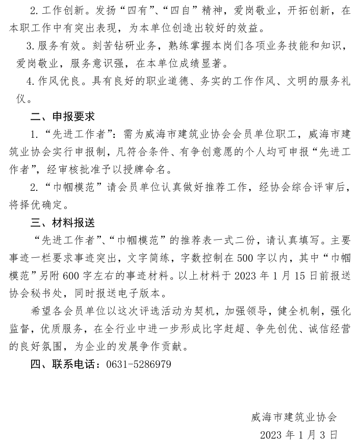 關(guān)于開展2022年度威海市建筑業(yè) “先進工作者”“巾幗模范”的通知