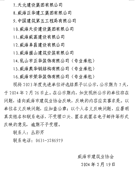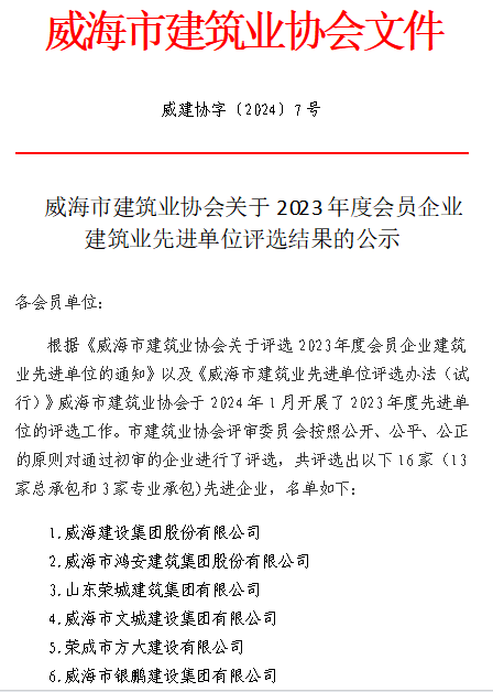 >威建協(xié)字2024年7號威海市建筑業(yè)協(xié)會關于2023年度先進單位評選結果的公示