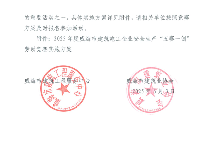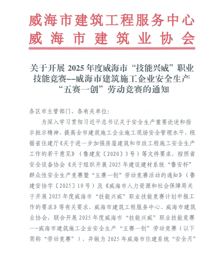 關(guān)于開展2025年度威海市“技能興威”職業(yè)技能競(jìng)賽--威海市建筑施工企業(yè)安全生產(chǎn)“五賽一創(chuàng)”勞動(dòng)競(jìng)賽的通知