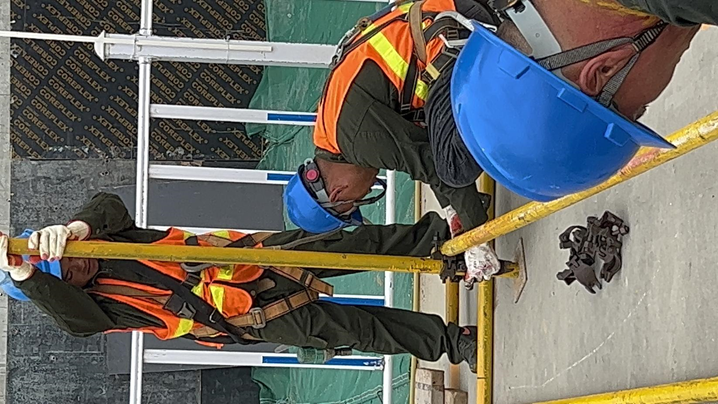 實(shí)際操作技能考試分23個小組分三個階段進(jìn)行比賽,參賽人員首先穿戴相關(guān)防護(hù)用品,安全帽安全帶等,每位選手都在規(guī)定的時間能完成防護(hù)用品的穿戴;第二階段-滿堂支撐架的搭設(shè):參賽人員開始按照圖紙搭設(shè)滿堂支撐架,過程中裁判員將對搭設(shè)過程中的規(guī)范操作進(jìn)行動態(tài)評分,搭設(shè)結(jié)束后裁判員對搭設(shè)成果進(jìn)行評分;第三階段-外腳手架的搭設(shè):參賽人員開始按照圖紙搭設(shè)外腳手架,過程中裁判員將對搭設(shè)過程中的規(guī)范操作進(jìn)行動態(tài)評分,搭設(shè)結(jié)束后裁判員對搭設(shè)成果進(jìn)行評分,大賽裁判長宮海波表示,實(shí)操競賽的幾個項(xiàng)目綜合考驗(yàn)了參賽者的搭建的穩(wěn)定、精準(zhǔn)和速度等。